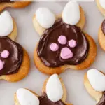 - Decorate Feet: Once the chocolate has dried and hardened, use a pink icing tube with a small pointed tip to draw paws on the chocolate area representing the bunny’s feet. Allow icing to dry completely.