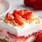 This No-Bake Strawberry Lasagna is a creamy, layered dessert that combines a crunchy graham cracker crust with smooth cheesecake and fluffy strawberry gelatin layers. Topped with whipped cream and fresh strawberries, it slices cleanly every time and is perfect for summer gatherings or special occasions.